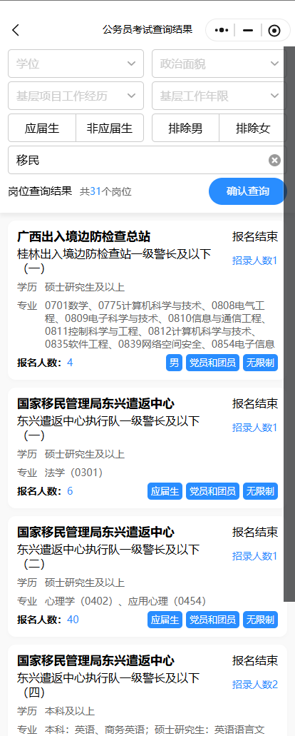 如駐廣西移民管理機(jī)構(gòu)崗位,在公考天眼輸入【移民】可查出2025年國考廣西崗位中,有31個崗位信息↓