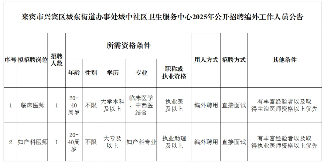 原文標(biāo)題:來賓市興賓區(qū)城中社區(qū)衛(wèi)生服務(wù)中心2025年公開招聘編外工作人員公告